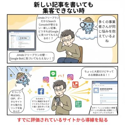 - 理由: Google BotはGBPの更新を最優先でチェックするため、新しい情報が早く見つかりやすくなります。この投稿からあなたのJimdoサイトへ誘導する経路は、非常に強力なシグナルとなります。