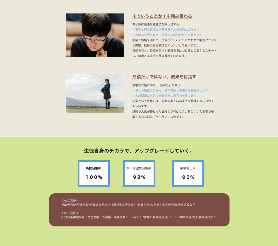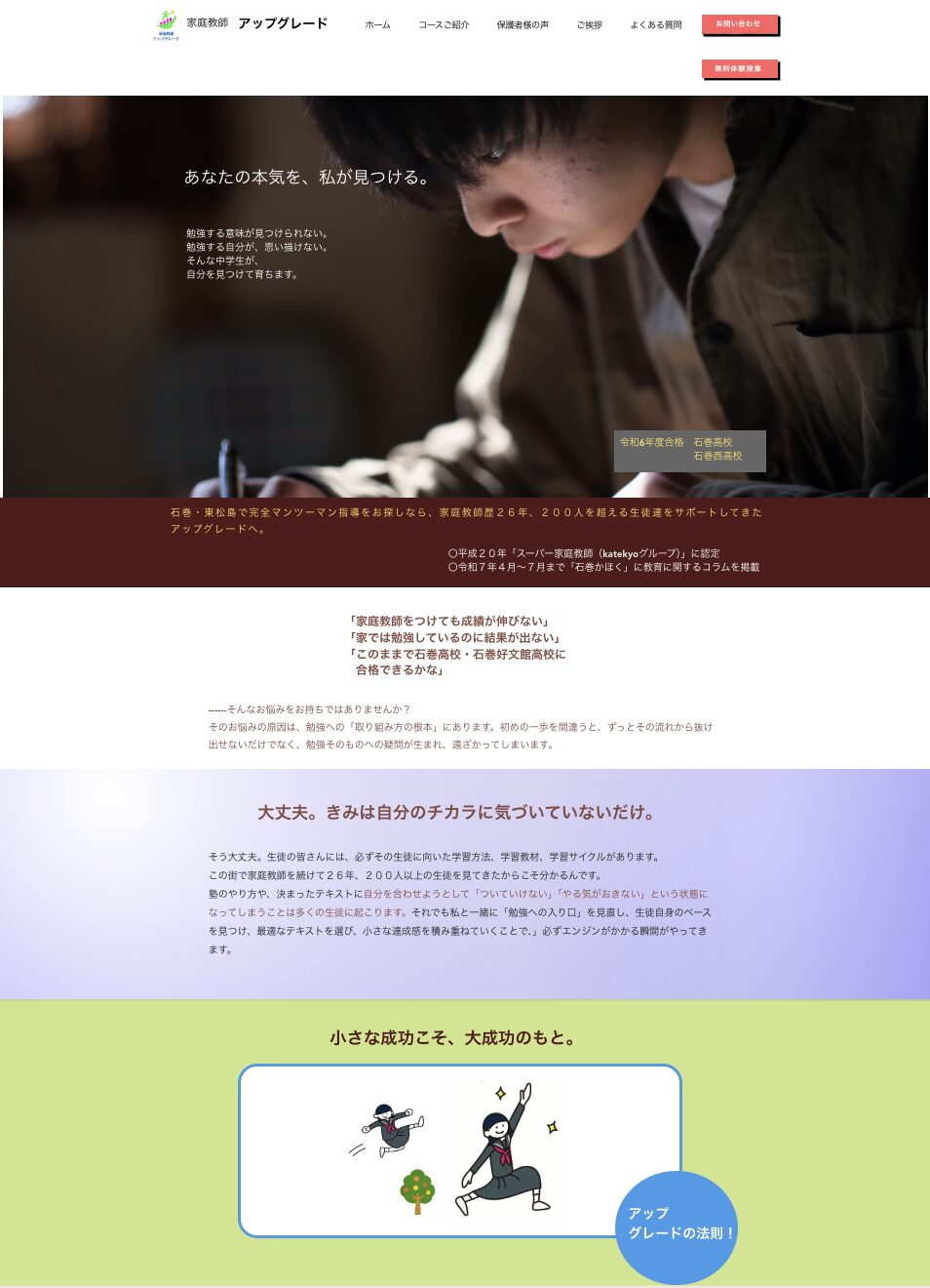 石巻・東松島で完全マンツーマン指導をお探しなら、家庭教師歴26年、200人を超える生徒達をサポートしてきたアップグレードへ。