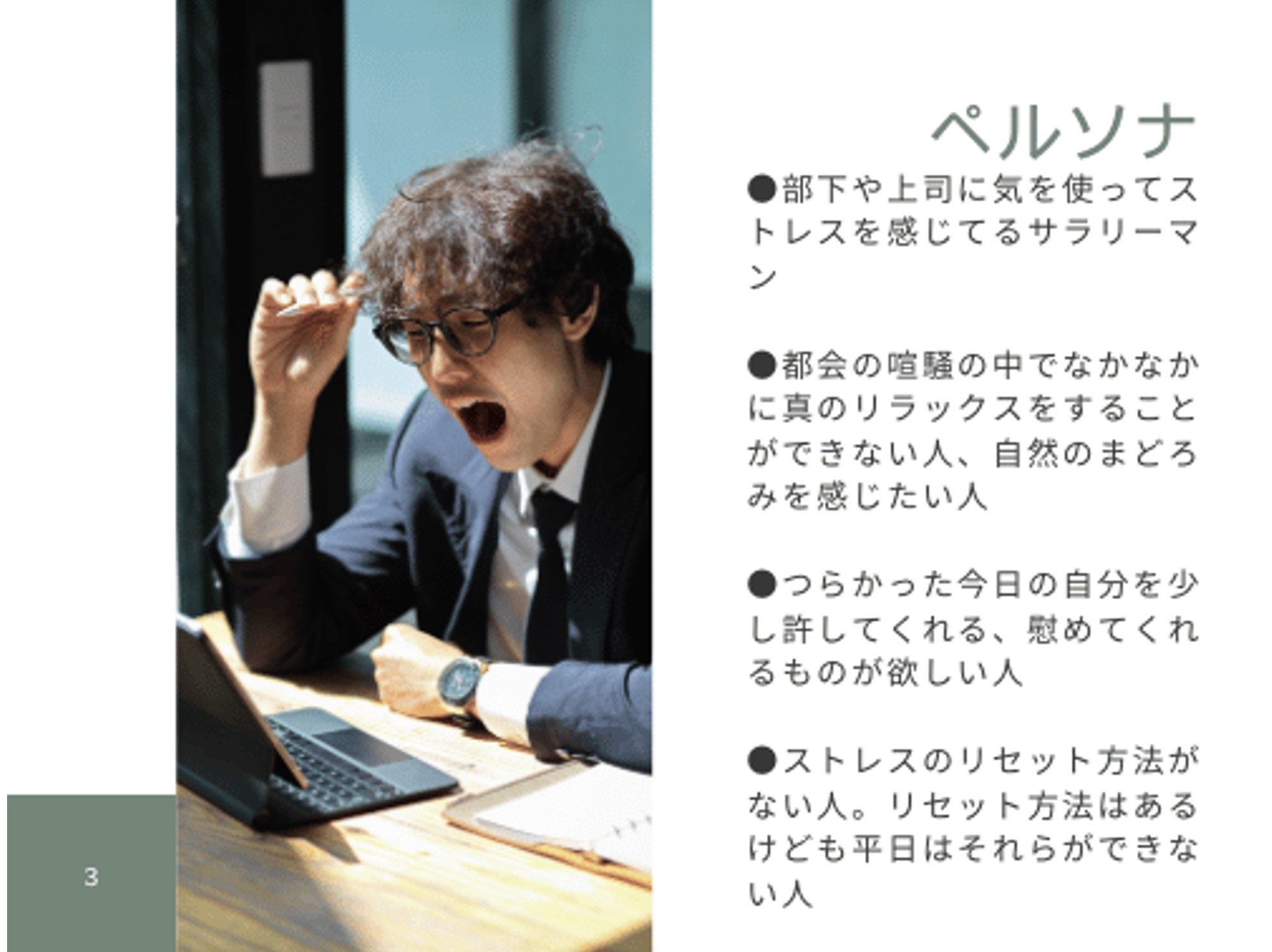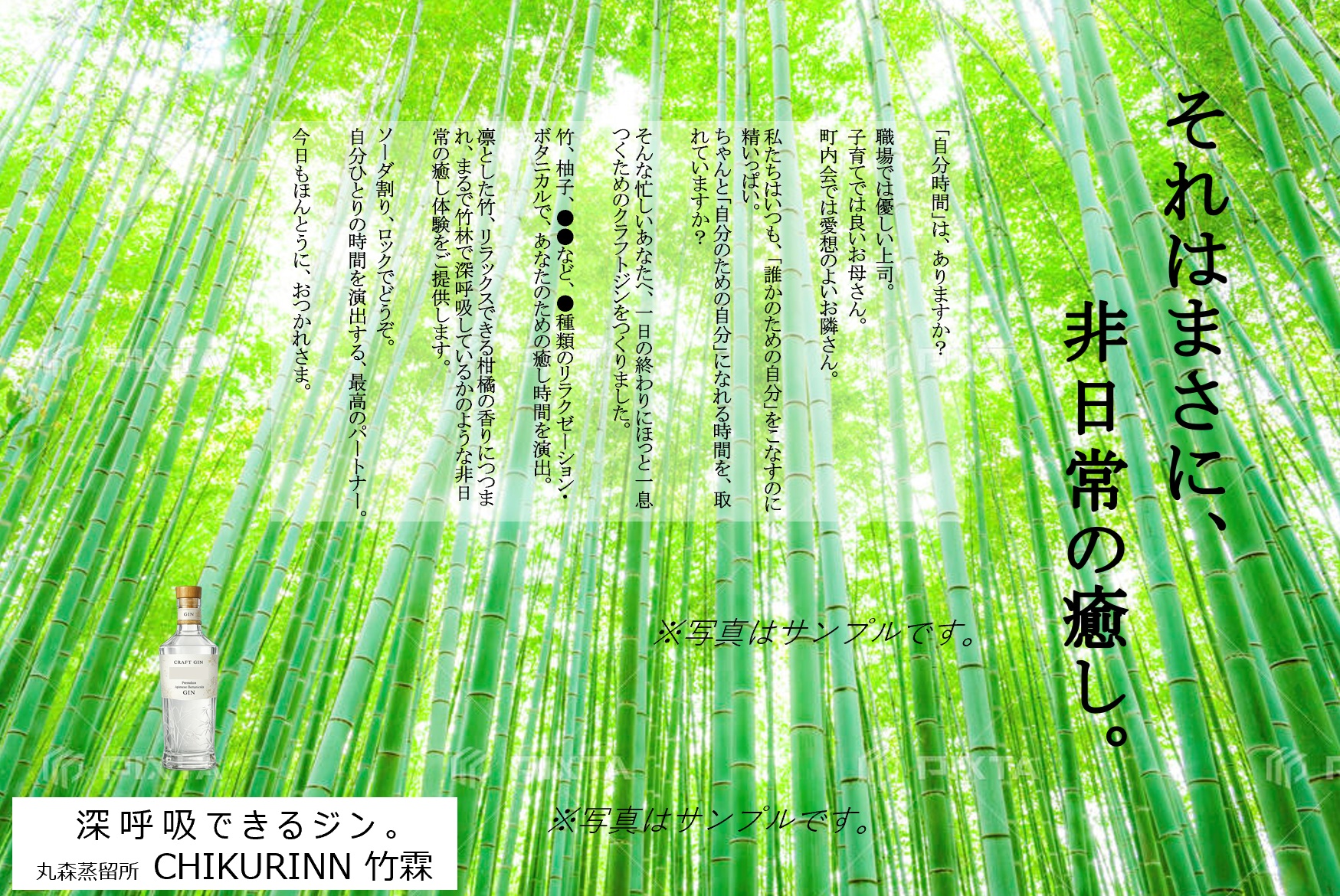 ボタニカルには竹も使っていく方向とし、商品価値を「飲むと、まるで丸森で森林浴をしたかのような竹や柑橘類のフレーバーを感じ、瞬間的に自然と触れ合える非日常体験でリラクゼーション(しみじみ)を感じられるドリンクであること。」と定義。利用シーンは、リラックスする時間にそっとよりそうジンとしてブランディングの方向性を整理していきました。タグラインは「深呼吸できるジン。」としてイメージを固めていきました。