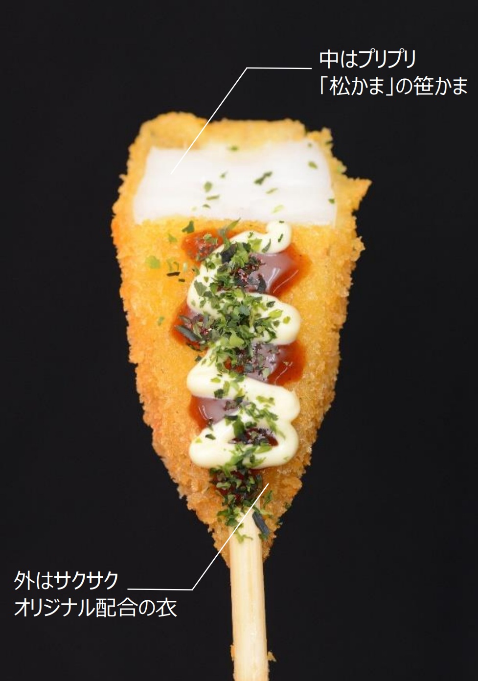 まず最初の難題として立ちはだかったのは、仕込み後「冷凍保存を可能にすること」「オーダー後に揚げたてを提供すること」でした。ご存知の方も多いと思いますが、市販の笹かまぼこは冷凍するとフワフワ感が失われスカスカした食感になってしまいます。この難題に対し、事業者さんは近隣の笹かまぼこ専門店に相談。幸いにも笹かまぼこ専門店オーナーの提案で、手焼き用の生笹かまぼこを卸してもらえることになりました。