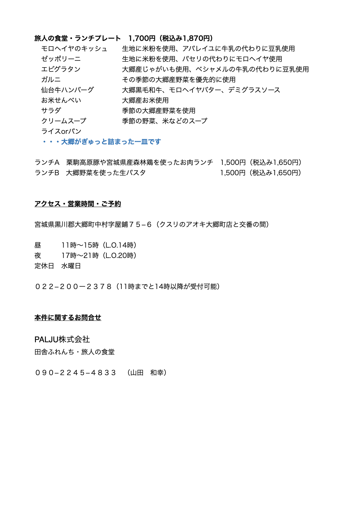 | 事業者名 | PALJU株式会社 旅人の食堂 |