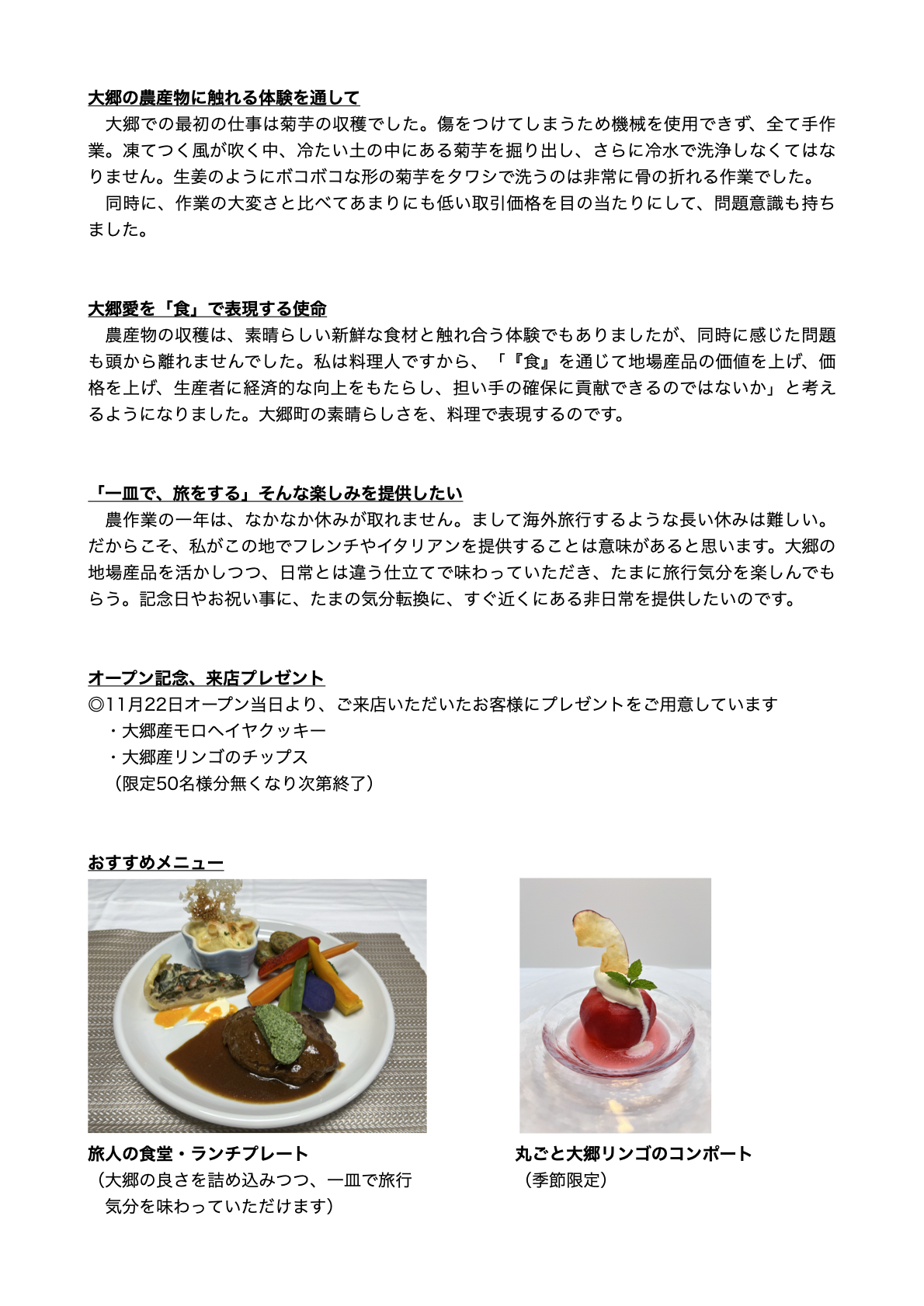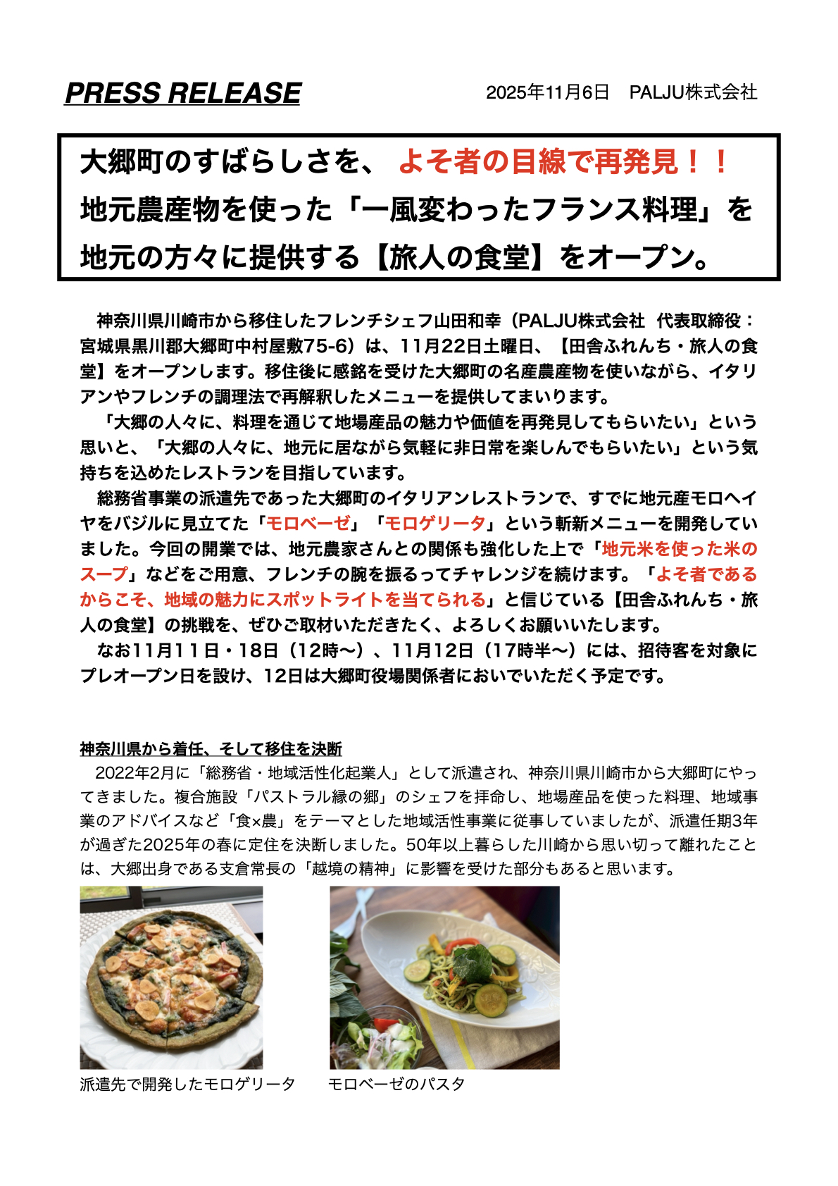 2022年、神奈川県川崎市から移住し、地域活性事業に従事していたオーナーシェフの山田さんは、2025年に思い切って定住することを決意しました。その経緯、思いについて深くお話を聞き、リリース本文に入れ込むことによって情報を「ストーリー」に仕立てました。また、大郷の食材の価値向上という使命感についても触れました。