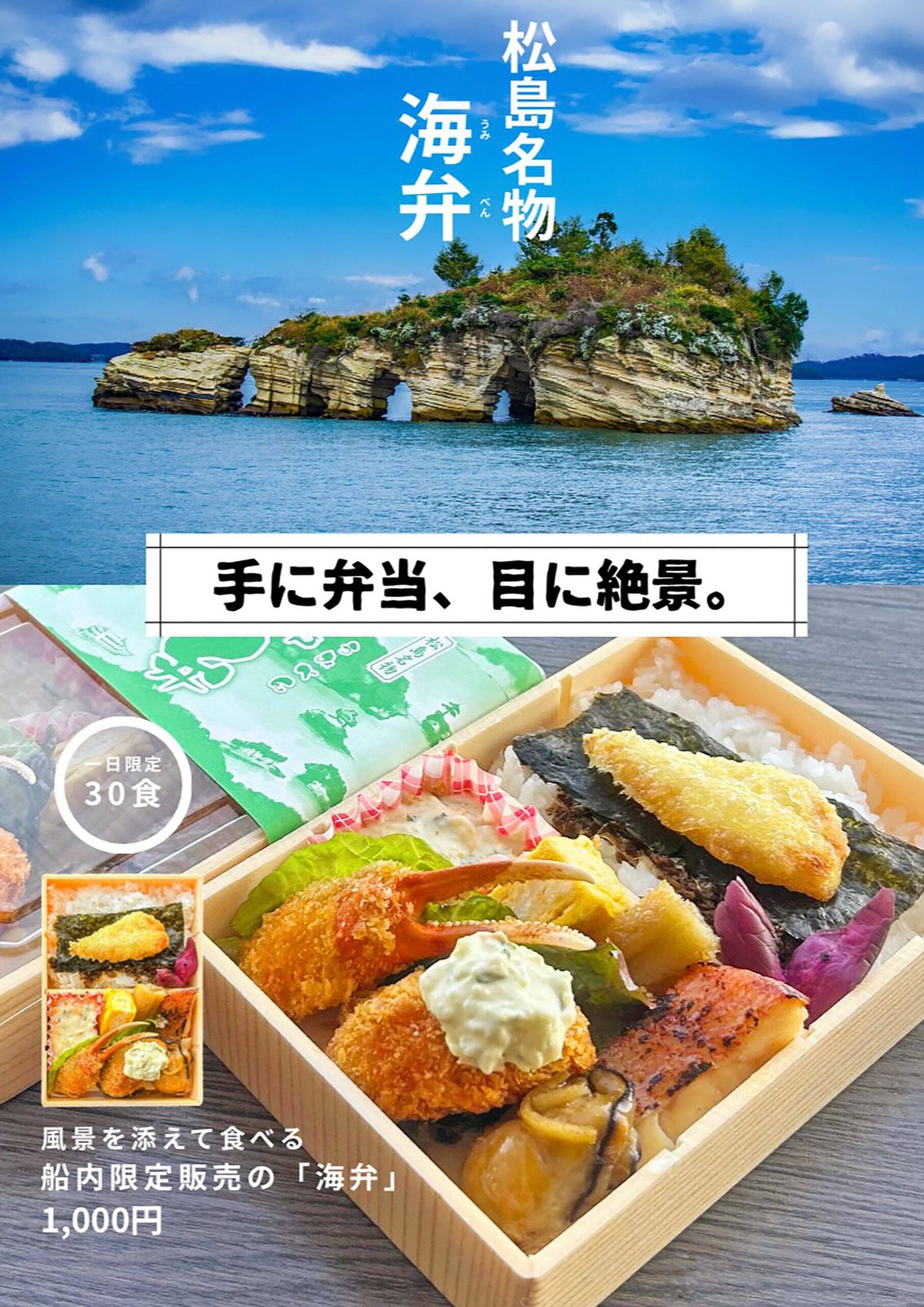 松島海岸通りの入口、遊覧船発着場が目の前にある松島離宮海の駅で『松島一望料理店 和食めん処 誉旨(よし)』を営む吉岡克訓さん。遊覧船『仁王丸』の船内限定で販売する「海弁(うみべん)」の開発・販売にあたり、当拠点では商品開発から資金繰り、広告クリエイティブ、デザイン制作、プレスリリースまで、コーディネーターの専門性を活かしたリレー型の伴走支援を行いました。単なる弁当販売ではなく、絶景とともに楽しむ新しい体験にしたい——。その想いが、よろず支援拠点のチーム支援で具体化していきます。