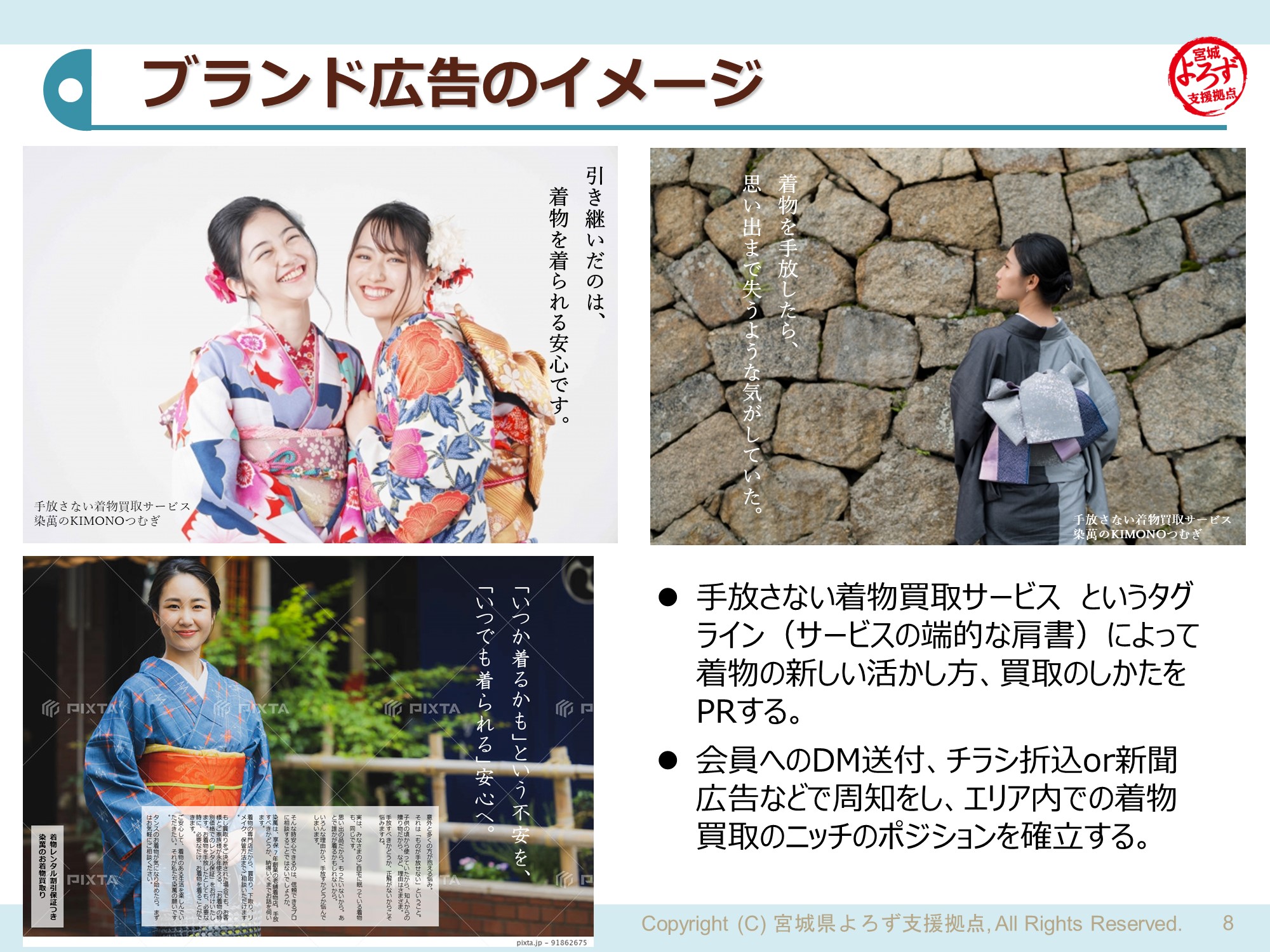 情緒面の差別化では、顧客心理に即した折込みチラシとキャッチコピーを検討。着物を手放す不安感を払しょくするため、岩手県よろず支援拠点のコピーライターである佐藤サブチーフとも連携して継続相談を重ねました。